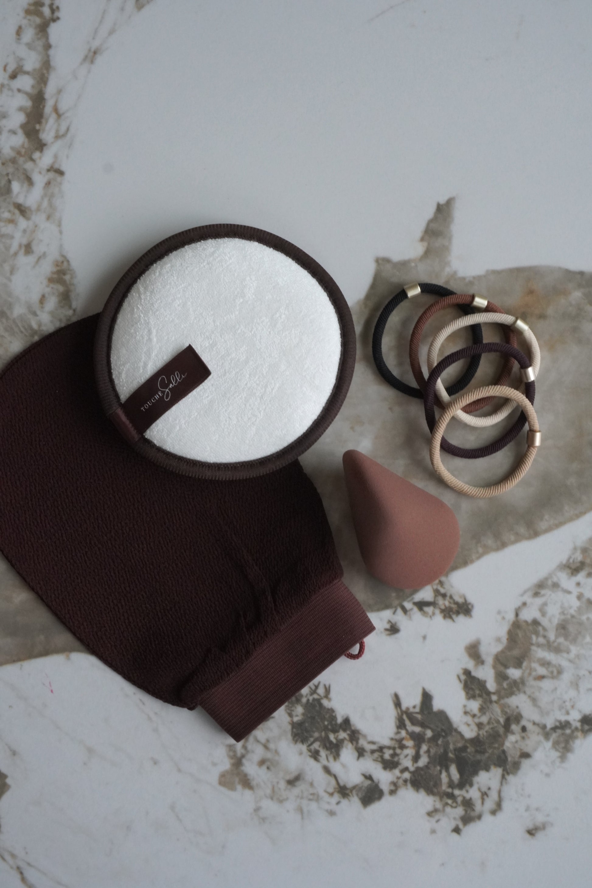Corpo Glow Exfoliating Mitt leveres i en hvid flatbox er omsluttet af et beige omslag i træfrit papir – fremstillet af restprodukt fra sukkerrør. En lille fortælling om skønhed i det, der bliver til overs.